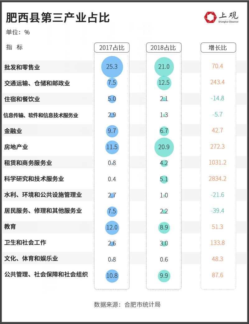 而批发零售、仓储运输、房地产与技术服务业,是肥西县第三产业产值提升的原因。