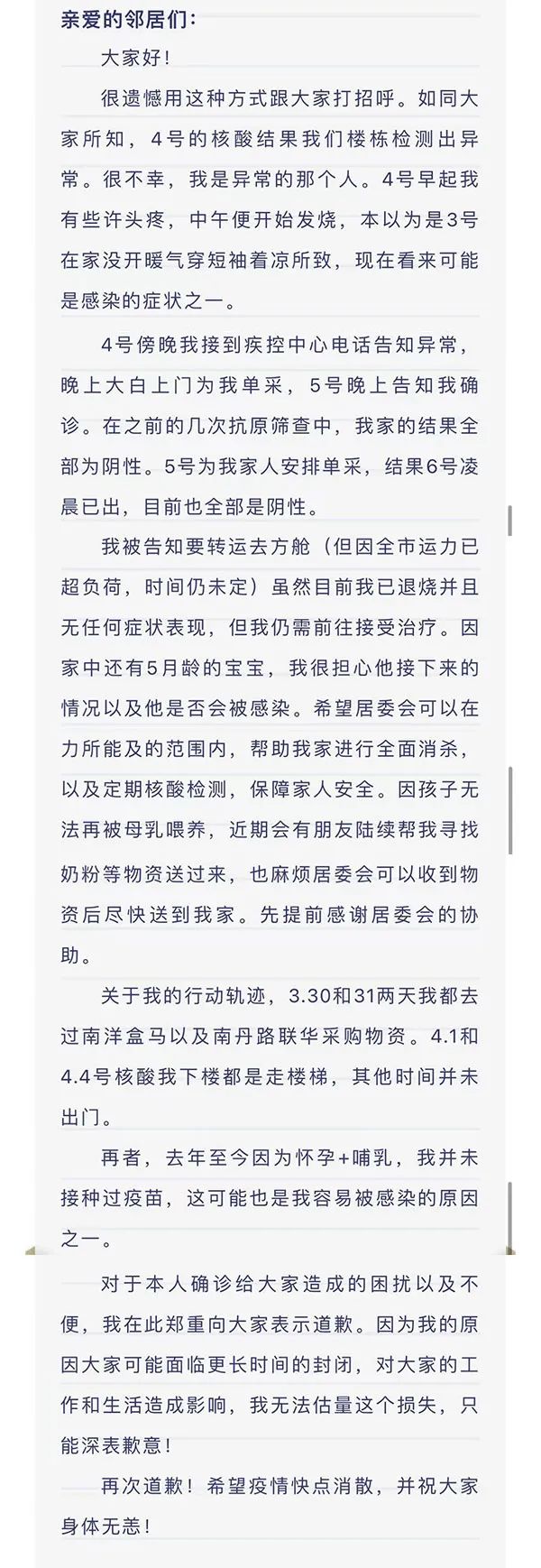 信的结尾处,她向邻居们郑重道歉。“因为我的原因大家可能面临更长时间的封闭,对大家的工作和生活造成影响,我无法估量这个损失,只能深表歉意!”