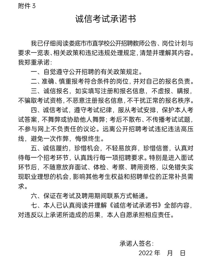 (三)报考者要严格遵守招聘纪律,并对提供的相关证件、资料的真实性负责,符合报考规定的须签订诚实守信承诺书。凡在招聘的任何环节发现有报考者不符合岗位报名条件、提供的材料弄虚作假或在考试过程中有徇私舞弊等违法违规行为的,一经查实,取消考试或聘用资格,并按照《事业单位公开招聘违纪违规行为处理规定》(人社部令第35号)进行处理。构成犯罪的,依法追究刑事责任。