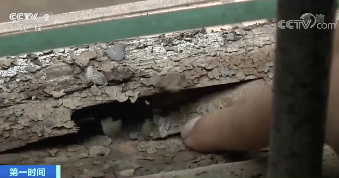 广东台记者 陈娜:在村民家里只要是木制品,都被飞蚁“光顾“过,窗的木制框已经被飞蚁咬烂,下面的横条已经变木碎渣,只要用手按一按,发现里面已经被蛀成空心了。