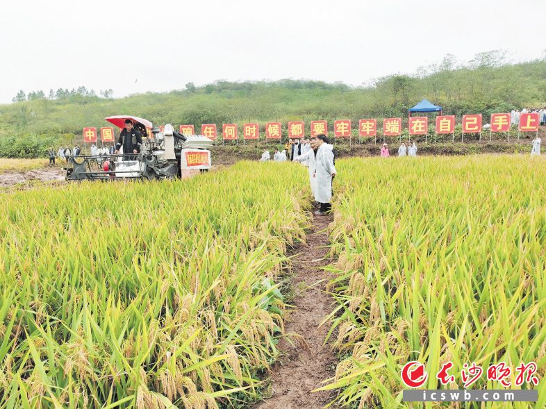 2021年10月,湖南衡南县清竹村示范基地迎来测产,第三代杂交水稻“叁优1号”晚稻亩产达936.1公斤,加上早稻亩产667.8公斤,周年亩产达到1603.9公斤。图为测产现场。长沙晚报通讯员 李建武 供图