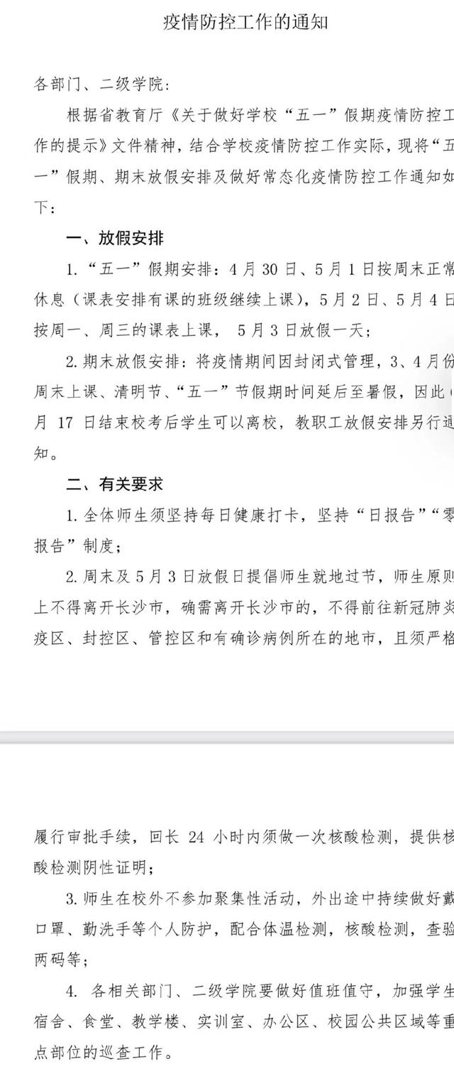 1.自2022年4月23日(第10周周六)起,每周周六师生正常上课,行政坐班人员正常上班,周日休息。