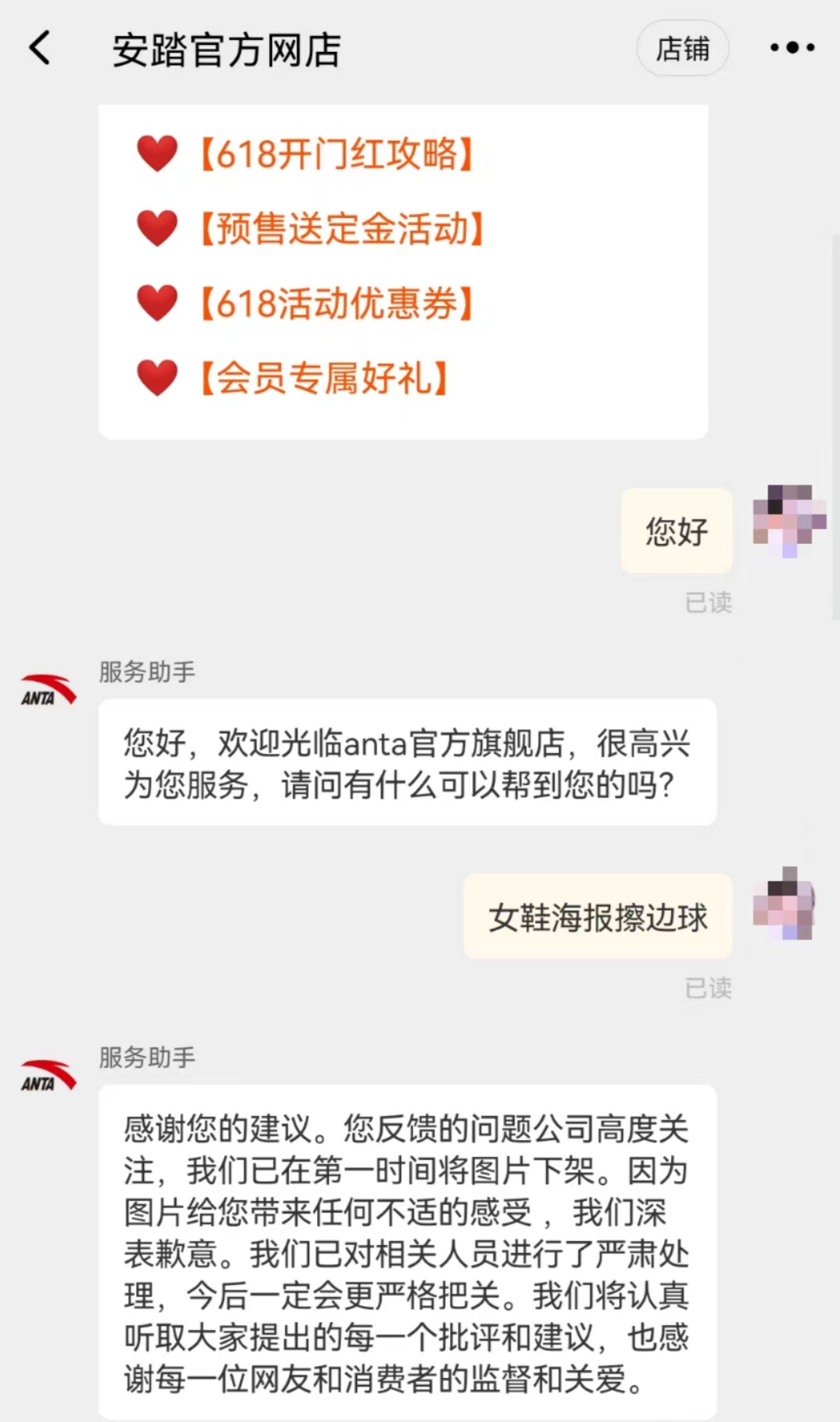 5月30日,红星资本局发现,目前安踏官方网店已将有关回应设置成自动回复,输入“女鞋海报擦边球”的关键词,服务助手会自动回复:“我们已在第一时间将图片下架。因为图片给您带来任何不适的感受,我们深表歉意。我们已对相关人员进行了严肃处理,今后一定会更严格把关。我们将认真听取大家提出的每一个批评和建议,也感谢每一位网友和消费者的监督和关爱。”