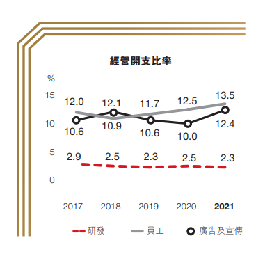 财报显示,2021年安踏的广告支出金额为61.17亿元,较2020年的35.51亿元增加了25.66亿元,增长幅度达到72.26%。2021年广告及宣传开支比率(占收益百分比)为12.40%,创近五年新高。
