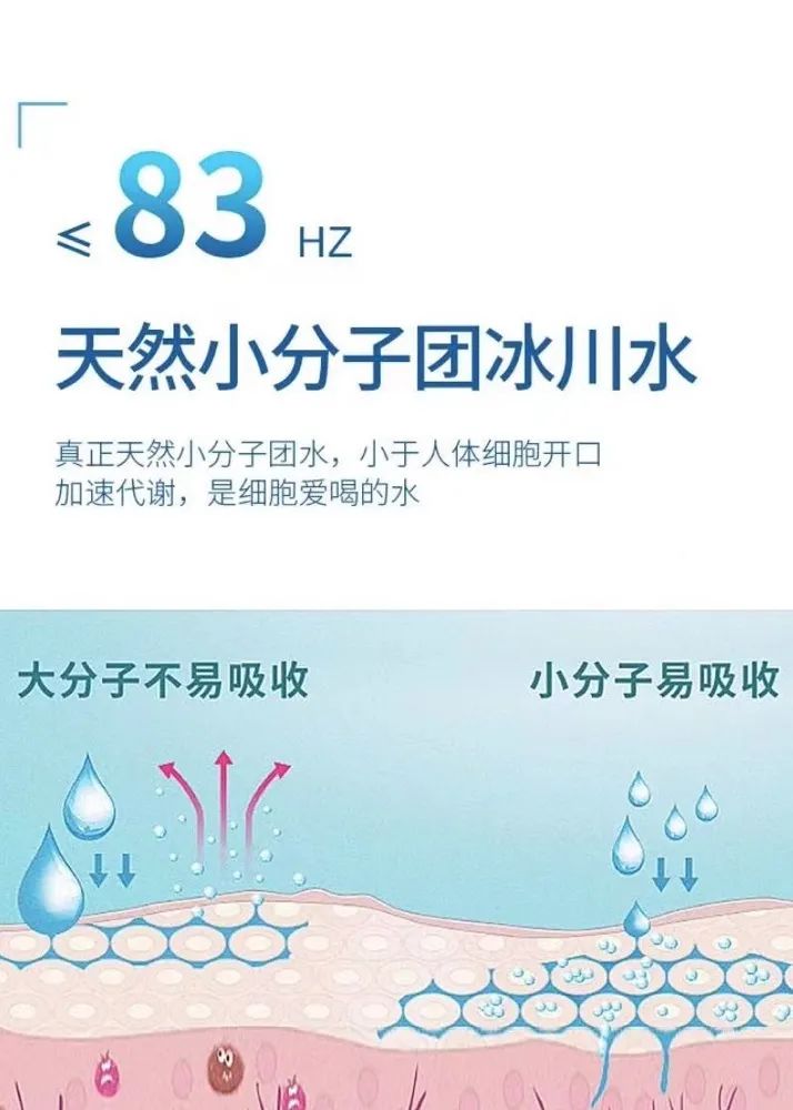 商家的宣传口径是:小于人体细胞开口,加速代谢,是细胞爱喝的水。估计细胞听到后也很纳闷:是吗,我怎么没感觉。