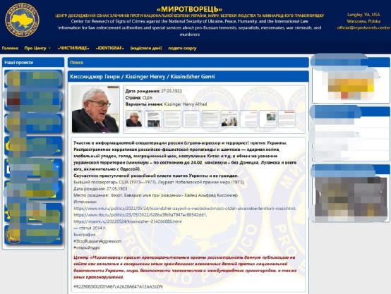 这一将基辛格列入“黑名单”的网站名叫“和平使者”(Myrotvorets),这一创建于2014年的网站是一个可以公开搜索的数据库,里面罗列了他们认为是“恐怖分子、战犯和杀人犯”的人员名单,名单中的人除了俄军部分现役军人外,也包括一些在俄乌冲突期间被认为“反对乌克兰”的西方政界人士。