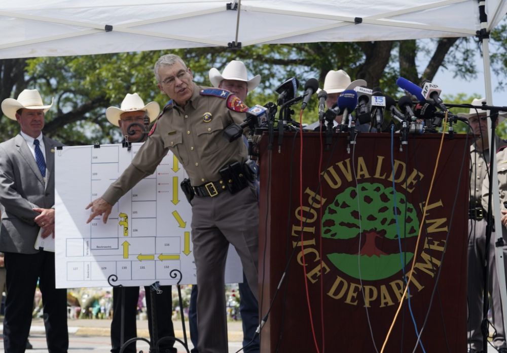 5月27日,在美国得克萨斯州南部尤瓦尔迪市,公共安全部门在发生枪击事件的小学外举行新闻发布会。新华社记者吴晓凌摄