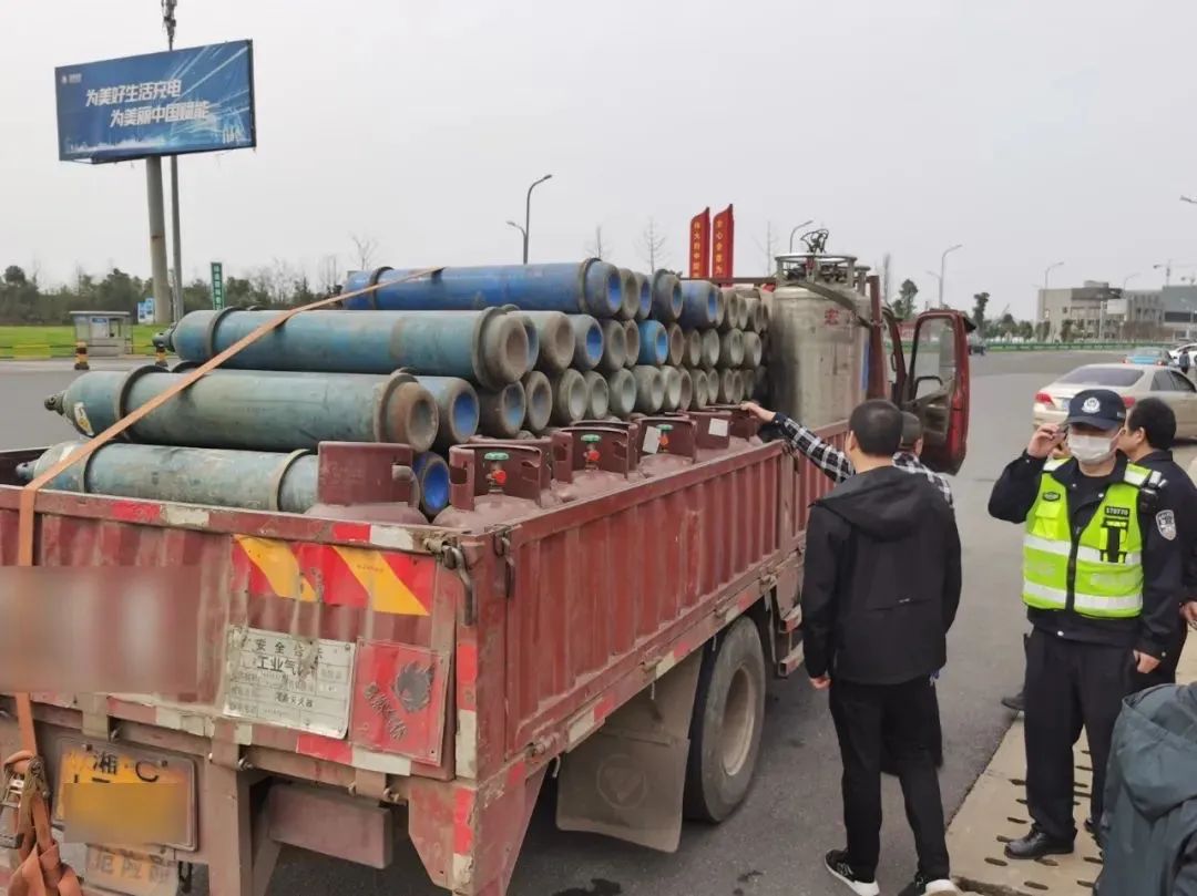3月11日9时许,湖南省高警局湘潭支队韶山大队民警在对一辆号牌为湘C1***8牌危化品货车进行检查时,发现该车存在超载、货物摆放不规范等违法行为。在随后的检查中,民警又发现该车装载了多种危险化学品,其中包括氧气、氩气、混合气体、液氧、丙烷等五种气体,存在重大安全隐患。