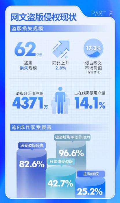 数据显示,截至2021年12月,盗版平台整体月度活跃用户量为4371万,占在线阅读用户量的14.1%,月度人均启动次数约50次。多数网络文学平台每年有80%以上的作品被盗版;82.6%的网络作家深受盗版侵害,其中频繁经历盗版的比例超过四成。