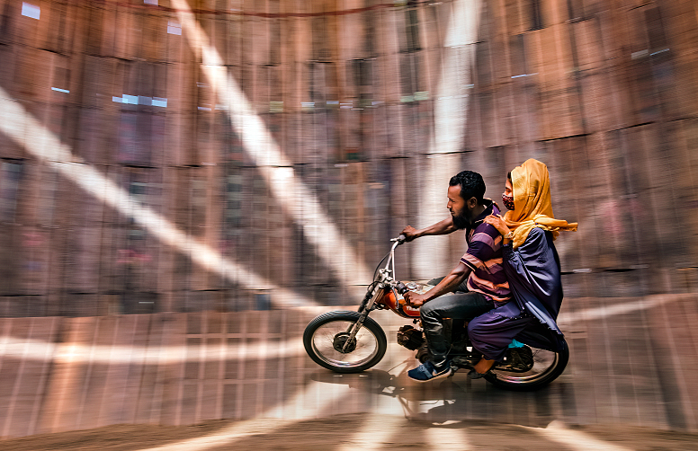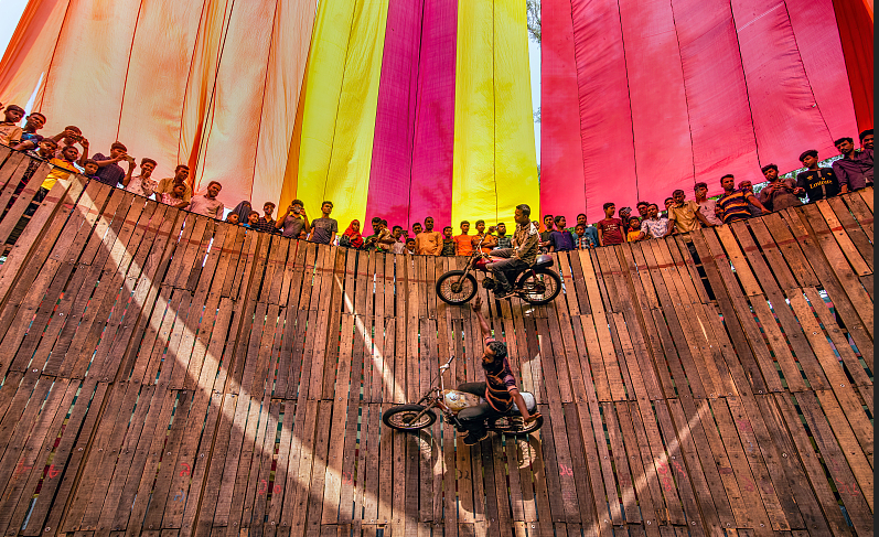 在孟加拉国博格拉,无所畏惧的车手在垂直的“死亡之墙”上骑摩托车或者开汽车。这些表演者保持着每小时60英里的时速,以确保他们的车辆能够在木制墙壁上保持平衡。