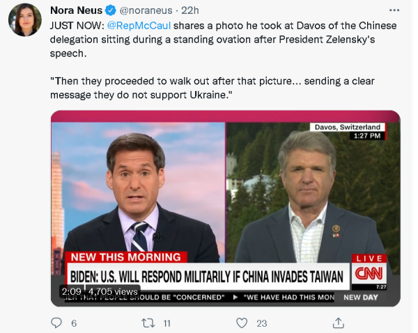 最初帮麦考尔传播谣言的CNN主播伯曼,以及他的制片人、CNN记者诺拉·纽斯(Nora Neus),也仍然在他们的社交账号上帮麦考尔扩散着所谓的“中国代表团不给乌克兰总统鼓掌”的说法。