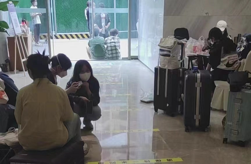 ↑无法办理入住,仍等候在酒店大堂的学生。本文图均为受访者供图