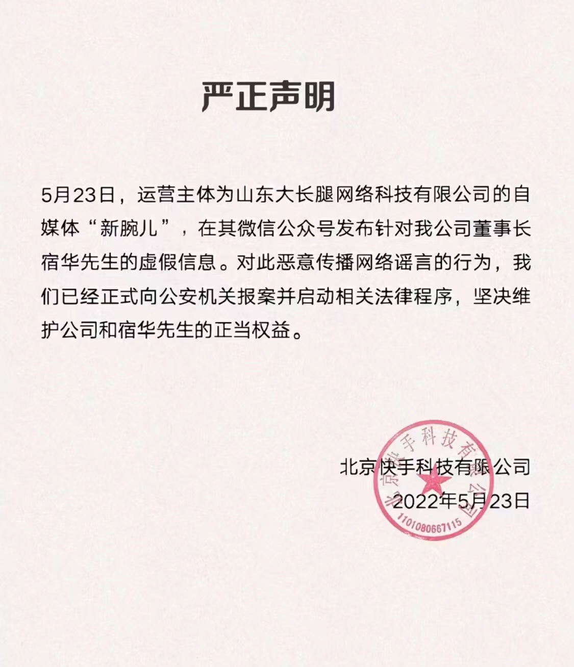 5月23日晚间,快手发表声明称,运营主体为山东大长腿网络科技有限公司的自媒体“新腕儿”在其微信公众号发布针对公司董事长宿华先生的虚假信息。