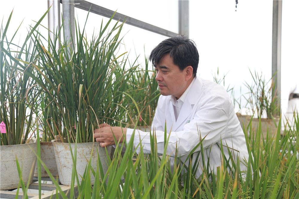 中国工程院院士、湖南省农业科学院党委书记柏连阳在实验室查看水稻生长情况(资料照片)。 新华社发(受访者供图)