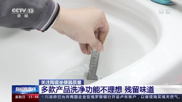国家建筑工程材料质量检验检测中心工程师 范俊杰:我们使用坐便器的时候,经常看到坐便器座圈内留着一部分水,这部分水就是为了防止下水道的臭气返溢到房间里面来的。这个深度是有一定要求的,需要在50毫米以上,我们在做的就是检测这个深度有没有达到这个标准值。