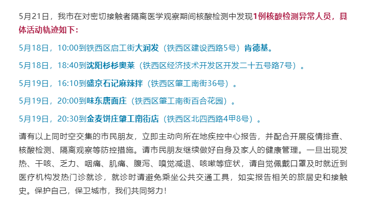 5月21日,辽宁省沈阳市在对密切接触者隔离医学观察期间核酸检测中发现1例核酸检测异常人员,具体活动轨迹如下: