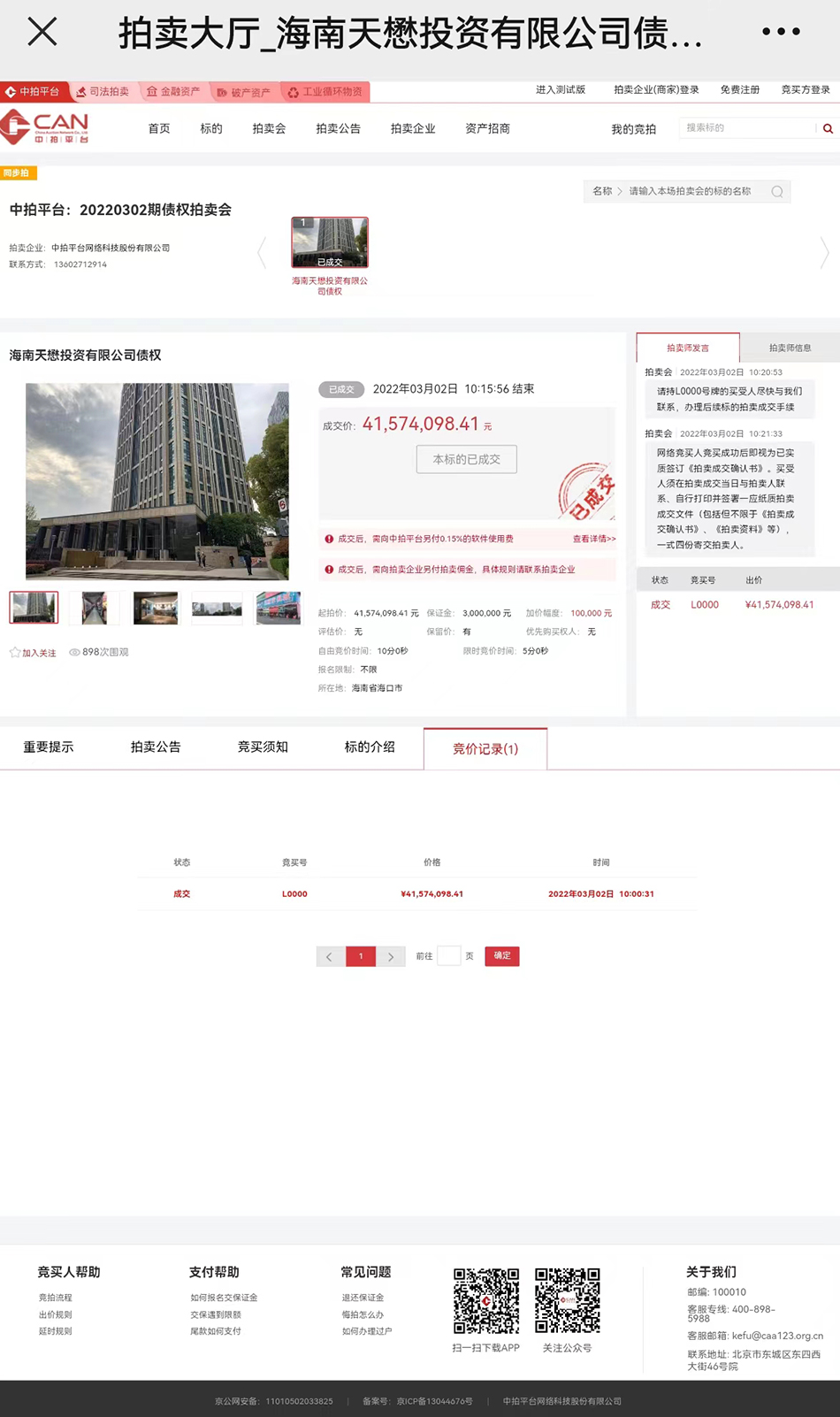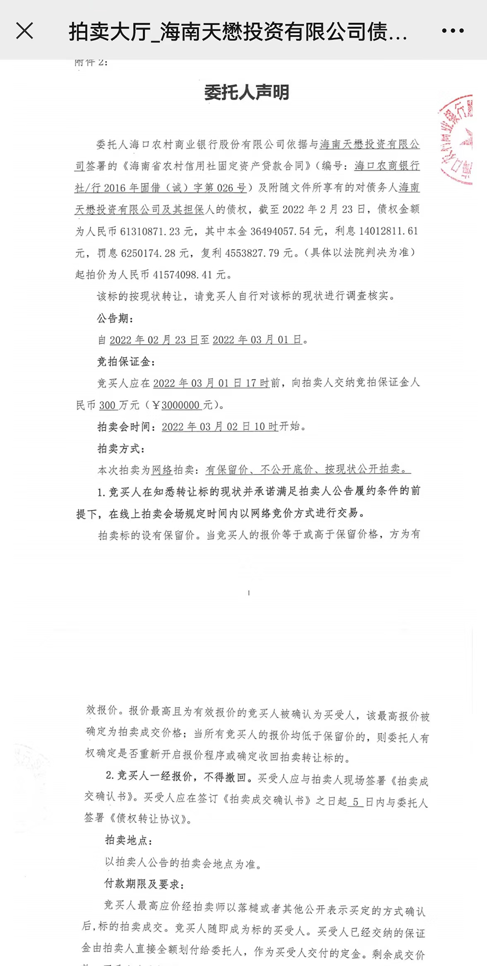 2022年2月23日,海口农商行委托拍卖公司在中拍平台对该起单笔债权进行公开拍卖。