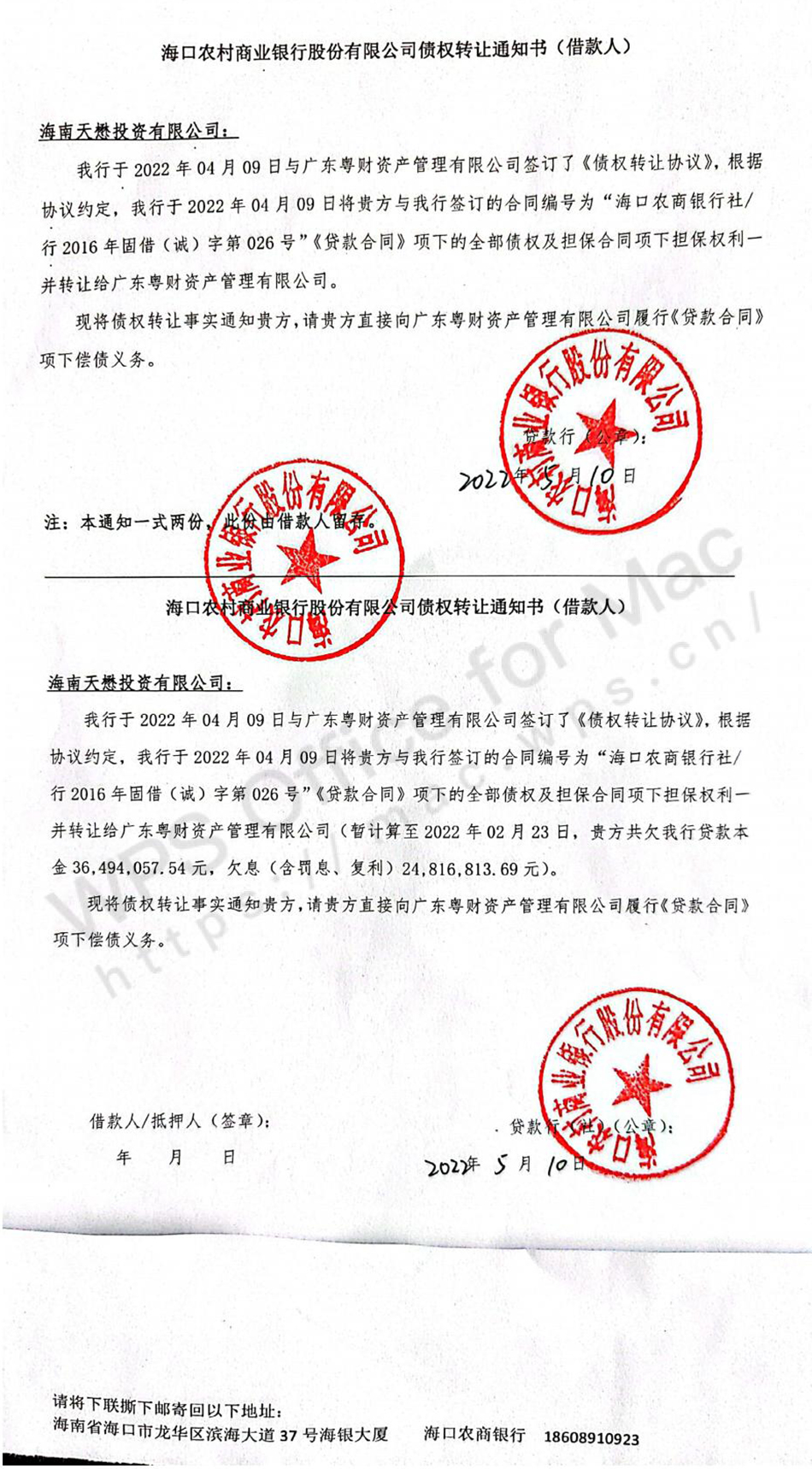 5月17日,海口农商行向海南天懋邮寄送达《债权转让通知书》称,该行4月9日将债权转让给广东粤财资产管理有限公司(以下简称:广东粤财公司)。