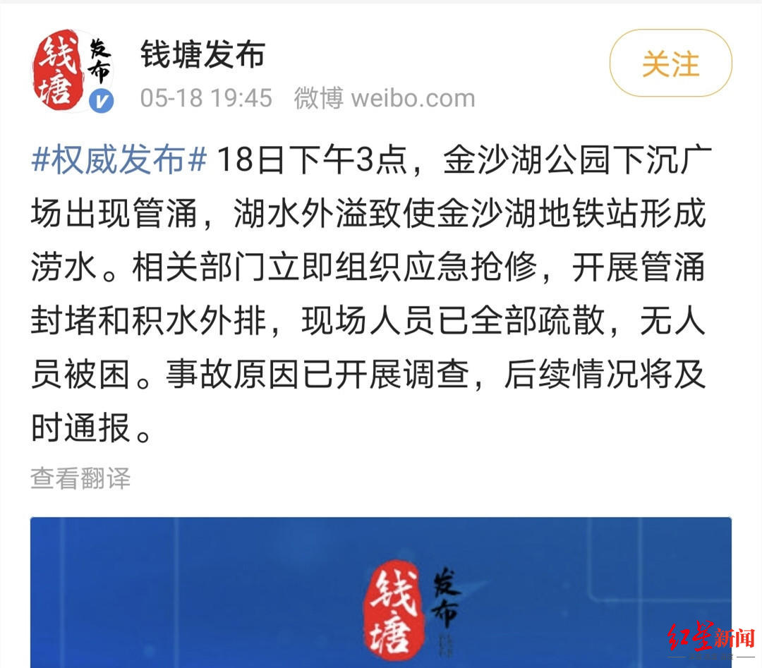 18日下午7时45分,“钱塘发布”官微通报,18日下午3点,金沙湖公园下沉广场出现管涌,湖水外溢致使金沙湖地铁站形成涝水。相关部门立即组织应急抢修,开展管涌封堵和积水外排,现场人员已全部疏散,无人员被困。事故原因已开展调查,后续情况将及时通报。