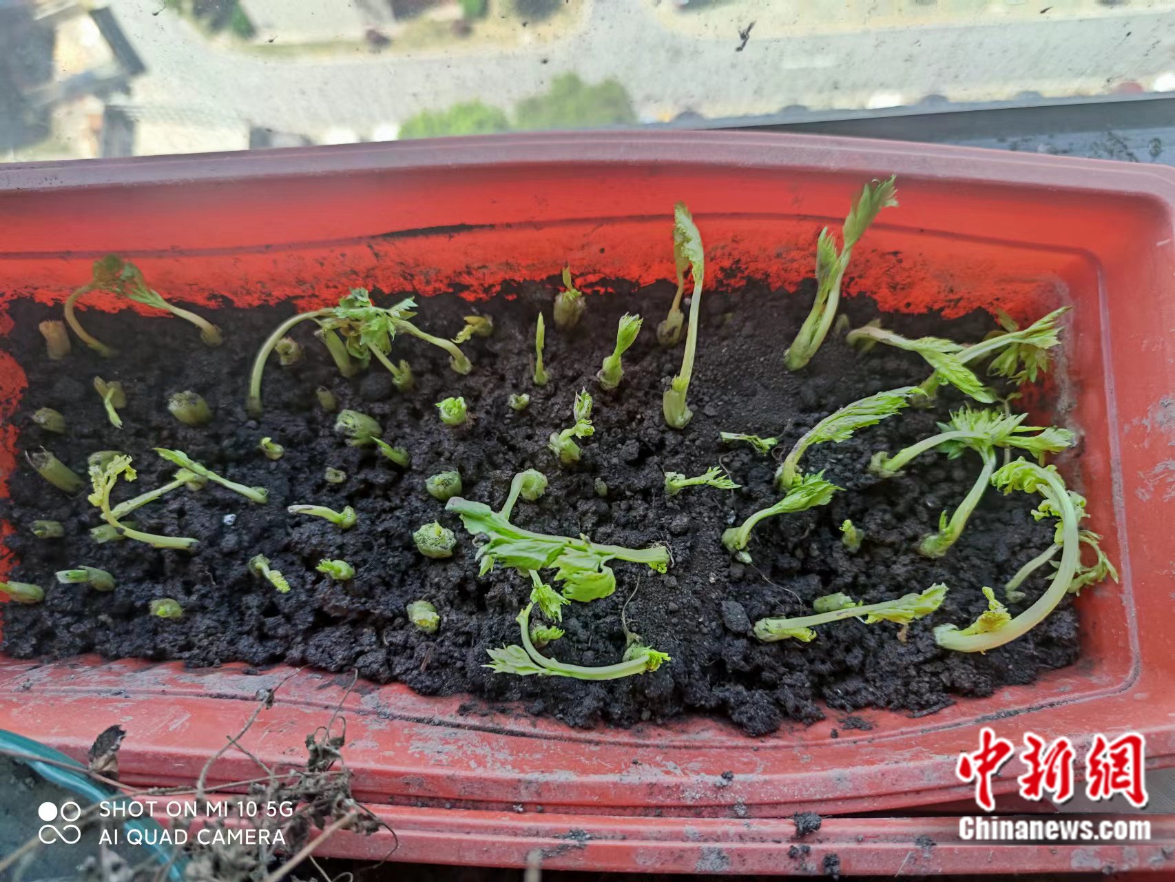 吴悦开玩笑,从来没有这么小心翼翼地处理过芹菜。浇水、晒太阳,一个多星期的时间,芹菜根又发了新芽。看着小菜芽慢慢长起来,吴悦忍不住感叹“土地的力量太强大了”。