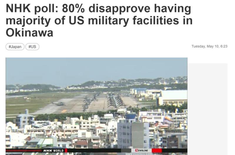 NHK发布的最新民调显示,约80%的受访者认为,不应把驻日美军基地“扎堆”设在冲绳。
