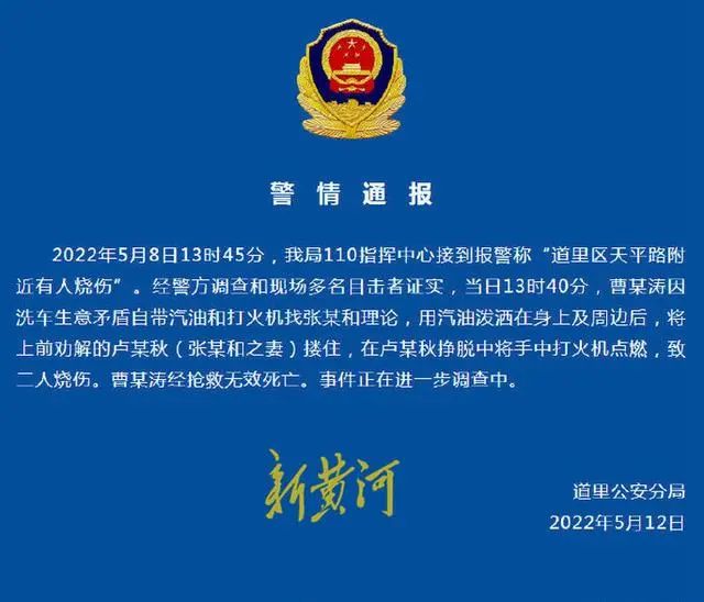 5月12日晚,哈尔滨市公安局道里分局发布警情通报称,5月8日13时45分,道里分局110指挥中心接到报警称“道里区天平路附近有人烧伤”。经警方调查和现场多名目击者证实,当日13时40分,曹某涛因洗车生意矛盾自带汽油和打火机找张某和理论,用汽油泼洒在身上及周边后,将上前劝解的卢某秋(张某和之妻)搂住,在卢某秋挣脱中将手中打火机点燃,致二人烧伤。曹某涛经抢救无效死亡。事件正在进一步调查中。