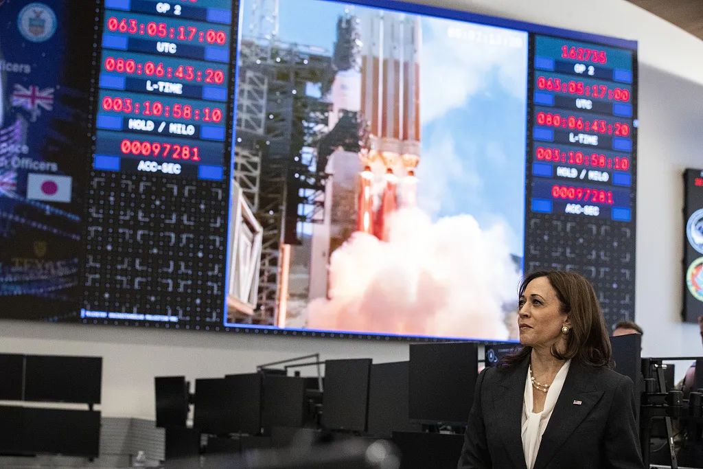 当地时间2022年4月18日,美国加州,美国副总统哈里斯访问范登堡空军基地时表示美国将放弃测试试射反卫星导弹。