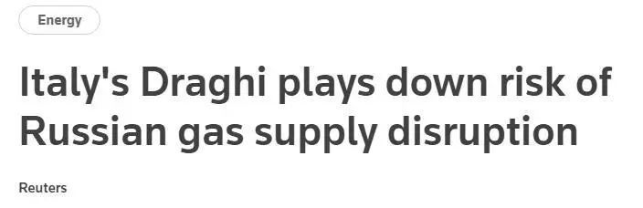 路透社称,意大利去年40% 的天然气进口依赖俄罗斯,并一直在紧急寻找替代供应商。德拉吉说,他相信莫斯科要求欧洲买家用卢布购买俄天然气不会导致供应中断。