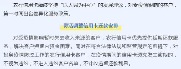 中国农业银行官方微信表示,对受疫情影响暂时失去收入来源的客户,农行信用卡优先提供延期还款服务,解决客户短期内资金困难。同时在符合法律法规和监管规定的前提下,对投身疫情防控工作的农行信用卡客户,在疫情期间的信用卡透支发生逾期的,不视为违约,不进入违约客户名单,不计收逾期还款利息。