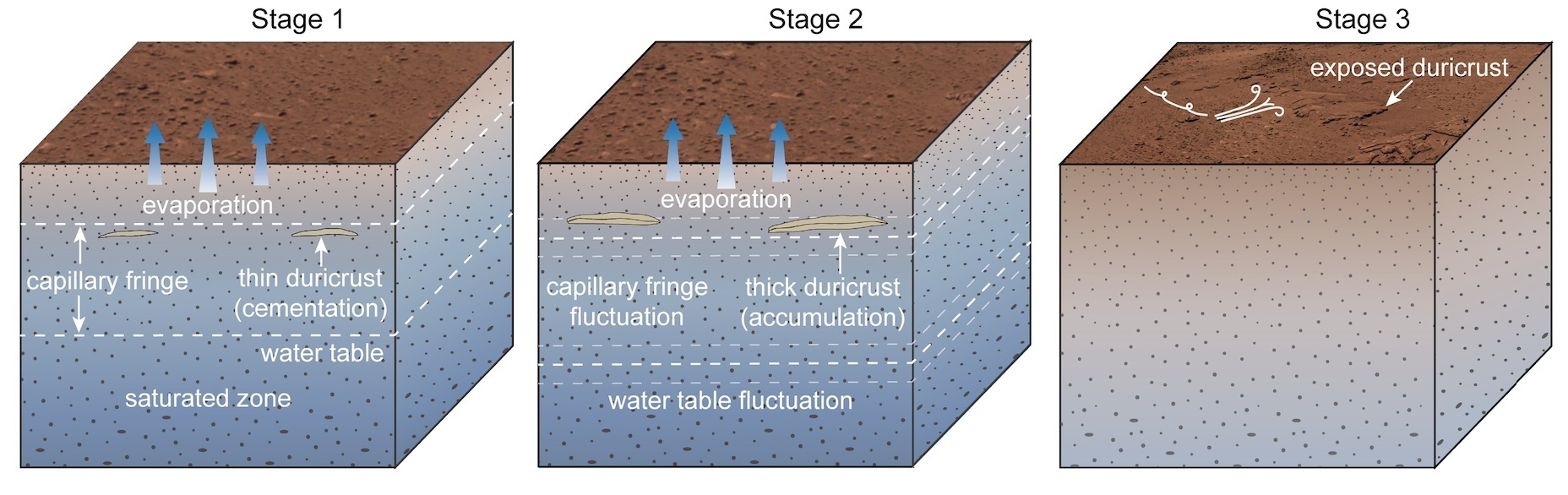↑祝融着陆区富含硫酸盐的岩化硬壳形成过程示意图。