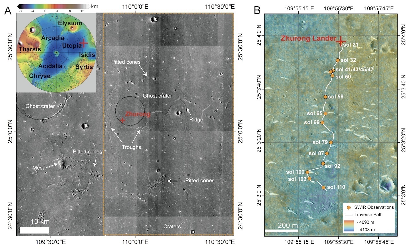 中国首次火星探测任务天问一号搭载的祝融号火星车于2021年5月15日成功着陆于乌托邦平原南部(北纬25.066°、东经109.925°)区域,首次在火星上留下了中国印记。截至目前,祝融号火星车已经在火星北部低地的乌托邦平原区域行驶1年,累计行驶近2千米 ,获得了大量宝贵的科学探测数据。已有的撞击坑定年工作显示,着陆区位于经过了后期重塑事件的亚马逊纪地层,是火星地质年代几个主要阶段(前诺亚纪、诺亚纪、西方纪和亚马逊纪)的末期,气候已经从以前的暖湿变为以寒冷干旱为主。轨道遥感数据分析显示,着陆点周围分布的多种地貌特征指示乌托邦平原曾经可能存在大量的挥发分。但受限于空间分辨率和覆盖率,轨道遥感数据并没有在着陆区附近发现含水矿物,这为此类地貌的形成机制和该地区水活动的性质带来了诸多疑问。