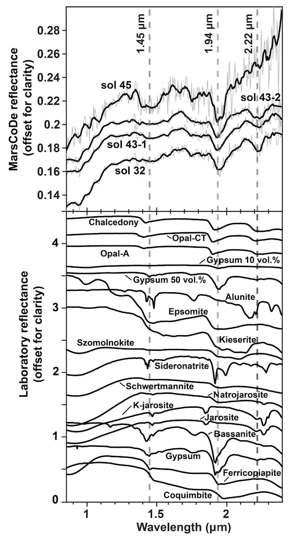 “这些板状岩石通常部分被灰尘和土壤覆盖,显示出剥落的表面,表明受到热应力和风成作用的物理风化。”刘洋说,“我们利用短波红外光谱在这些亮色板状岩石中探测到了之前轨道数据在该区域没有识别到的含水矿物,这些光谱具有~1.9μm和~2.2μm吸收特征,推测其为含水硅或含水硫酸盐。”