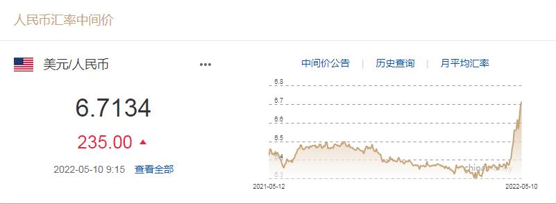 中国人民银行授权中国外汇交易中心公布,2022年5月10日银行间外汇市场人民币汇率中间价为:1美元对人民币6.7134元,较上一交易日下调235个基点,跌回6.7元时代。
