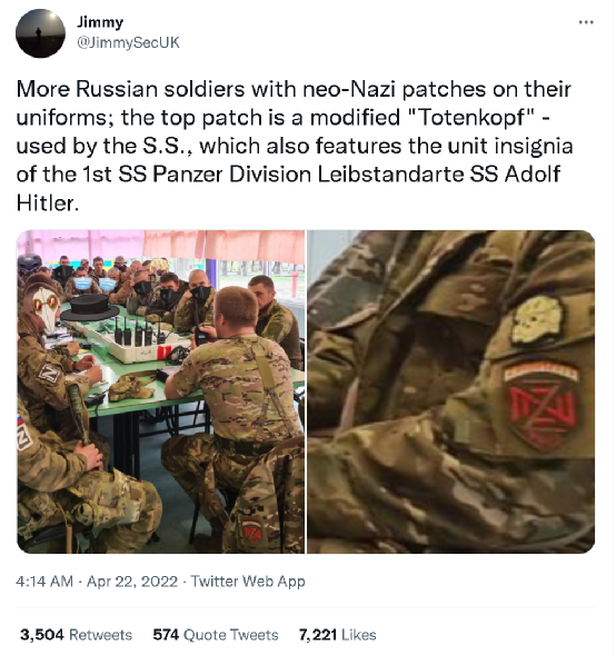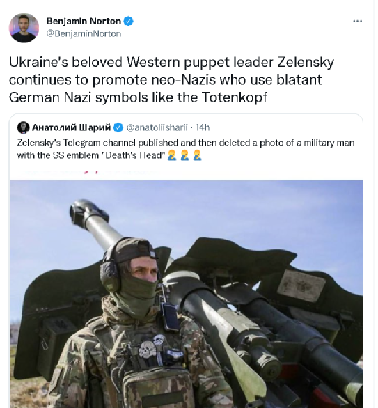 然而,有网民却指出,在其中一张内容为一名乌克兰士兵站在一门大炮边的照片中,该士兵胸前佩戴的徽记,是曾被纳粹德国的“骷髅部队”使用过的一个专有的“骷髅头”标志。