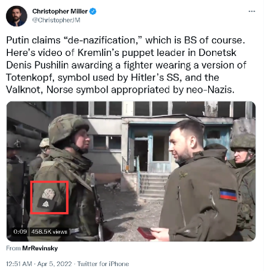 但乌克兰的支持者则表示,乌克兰东部亲俄罗斯的武装势力此前也曾被发现使用这种“骷髅头”徽记。今年4月,多家西方媒体和西方媒体人密集报道过其中一起事件,想以此证明俄罗斯才是“纳粹”。