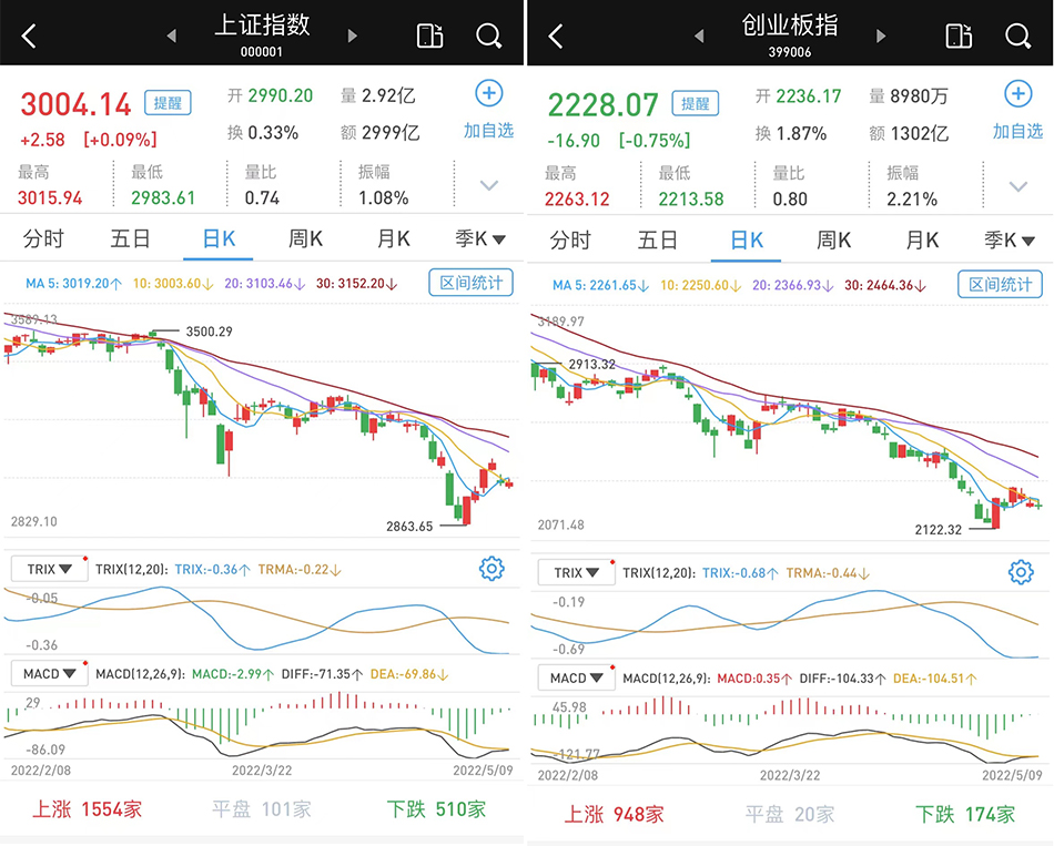 至5月9日收盘,上证综指涨0.09%,报3004.14点;科创50指数涨0.48%,报946.72点;深证成指跌0.41%,报10765.63点;创业板指跌0.75%,报2228.07点。