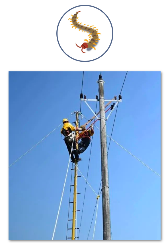 这种梯子绝缘性能良好,还可以分段拆装携带。垂直挂在接触线上时,左右伸出脚蹬让梯子远远看上去犹如一条长长的蜈蚣。