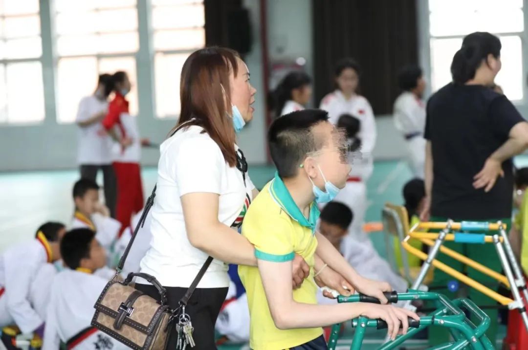 在文艺活动排练现场,妈妈雷建红准备扶着刘勇上台表演。