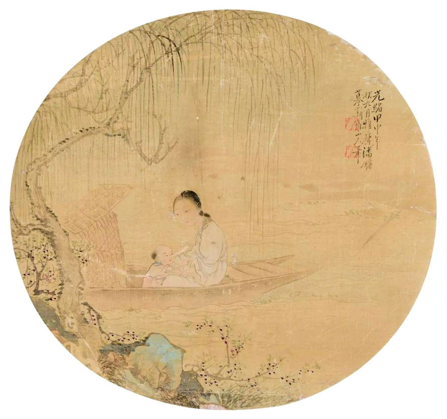 潘镛《母子图》扇面展示的另一种场景。秋日泛舟湖上,母亲带着孩子游玩,柔柳小花,轻舟细波,组合成秀美的江南景致。用笔细腻,风格唯美,将母亲的安详和孩童的天真,完美地呈现出来。