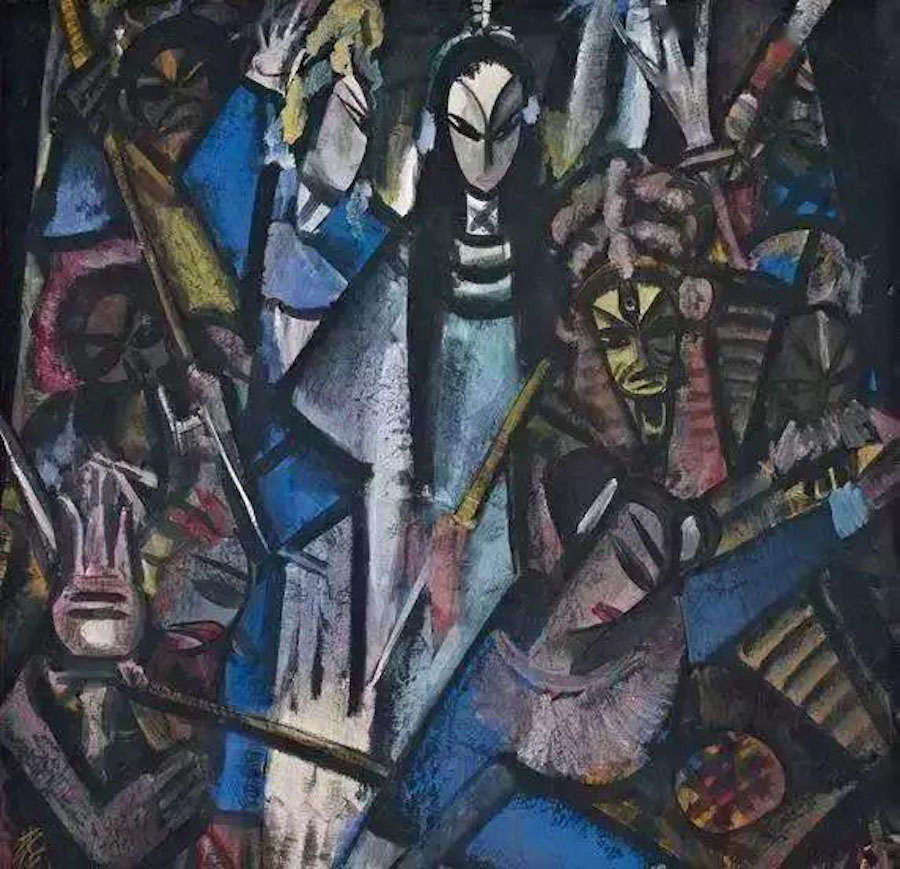 当代大师林风眠绘《劈山救母》,源自《宝莲灯》中沉香救母的典故。林风眠一而再、再而三画沉香救出母亲的主题,与他幼年即失去母亲的痛苦记忆有关,倾注了他渴望解救母亲于悲惨命运和希望母子团圆等诸多强烈情感。林风眠大约从二十世纪五十年代左右开始创作戏曲绘画,逐渐探索出一种新的造型语言,将中国传统戏曲与西方立体主义的表现形式完美地结合了起来,为中国现代艺术的发展开启了一个新方向。可以说,在二十世纪中国近现代绘画的发展与变革中,林风眠的戏曲人物画及其造型理论占据着一项重要的位置,他以传统京剧舞台的场景为依托,结合中西方美学之所长,跨越传统与现代的鸿沟,在色彩与形式结构,空间与时间的关系方面皆进行了前所未有的突破。画面色彩以深蓝和赭黄为主,三圣母的衣裙以深蓝和重墨平涂,再随着优雅的舞蹈式动作绘出一件半透明的轻薄白纱,减轻了画面的浓重感;沉香以暖色笼罩,与三圣母构成冷暖对比,暗示着拯救之意。后面的几何化金色背景光影强烈,烘托出两人的处境,明亮的背景亦使前景人物产生逆光式的效果,延展出丰富的空间深度。林风眠借助两种不同的艺术形式作为载体,所探讨的是形式与内容的关系,时间与空间的连续与对立等现代性主题。