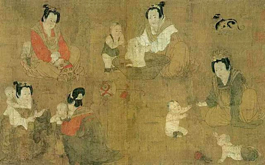 普通人家,则更为珍视和享受到这份难得的舔犊之情。宋佚名《浴婴图》描绘的正是这个场景。图外“周文矩”款字,系后添,此作当为宋人作品。画面共三个妇人,四个小孩,当中摆一长形浴盆。古人相信,沐浴可以把水滋生万物的力量传递给婴儿,让其健康成长,由此而言,洗澡具有礼仪性甚至是宗教性的内涵。如果仔细看,三位女性在穿着打扮和姿态上有明显区分。无论是衣着、发式还是姿势,画中间蹲在浴盆旁给小朋友洗澡的女性,和画右边给另一个小朋友穿衣服或脱衣服的女性是一组。她们的衣裙都是白、青两种颜色,都梳着类似唐代堕马髻一样的发型,而且都蹲在地上。画面设色淡雅明快,气氛温馨和谐,妇人的神情慈祥、婴儿的天真无邪,无不充满了浓郁的人情和现实意义。