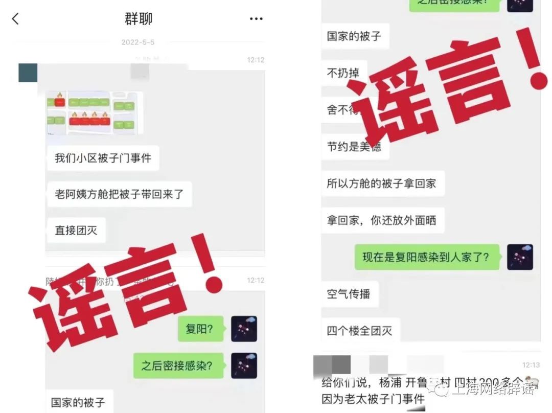 昨日,上海辟谣平台收到不少网友留言,称有多则聊天记录提到“一个老太方舱回来偷偷把那边被子带回来……然后阳台晒”,导致数层楼全阳。相似传言在多个区传播。