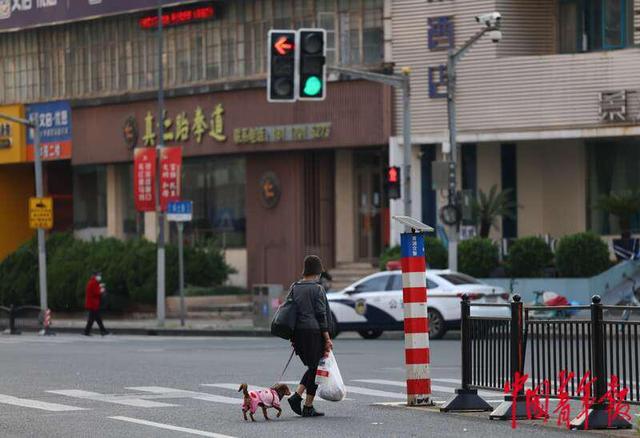 5月3日,上海市黄浦区,“电话亭女士”牵着她的小狗走在马路上。中青报·中青网记者 李强/摄