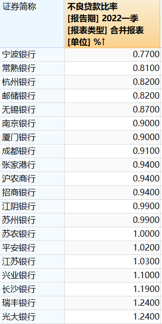 资产质量方面,截至今年一季度末,宁波银行不良贷款率最低,为0.77%。常熟银行、杭州银行、邮储银行、无锡银行、南京银行等13家银行的不良贷款率也均低于1%。杭州银行、常熟银行、宁波银行、无锡银行拨备覆盖率居前,均超过500%。