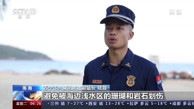 海南万宁市兴隆消防站副站长 陆磊:一定要在划定的海水区域进行冲浪运动,下水前要检查冲浪板、安全绳并做好热身运动。冲浪板不要离岸边太近,避免被海边浅水区的珊瑚和岩石划伤。如果发现有人溺水,要及时向岸边安全员求助。