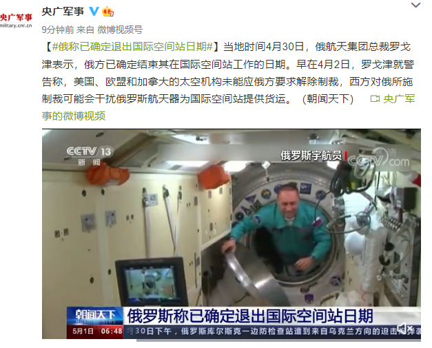 当地时间4月30日,俄航天集团总裁罗戈津表示,俄方已确定结束其在国际空间站工作的日期。早在4月2日,罗戈津就警告称,美国、欧盟和加拿大的太空机构未能应俄方要求解除制裁,西方对俄所施制裁可能会干扰俄罗斯航天器为国际空间站提供货运。