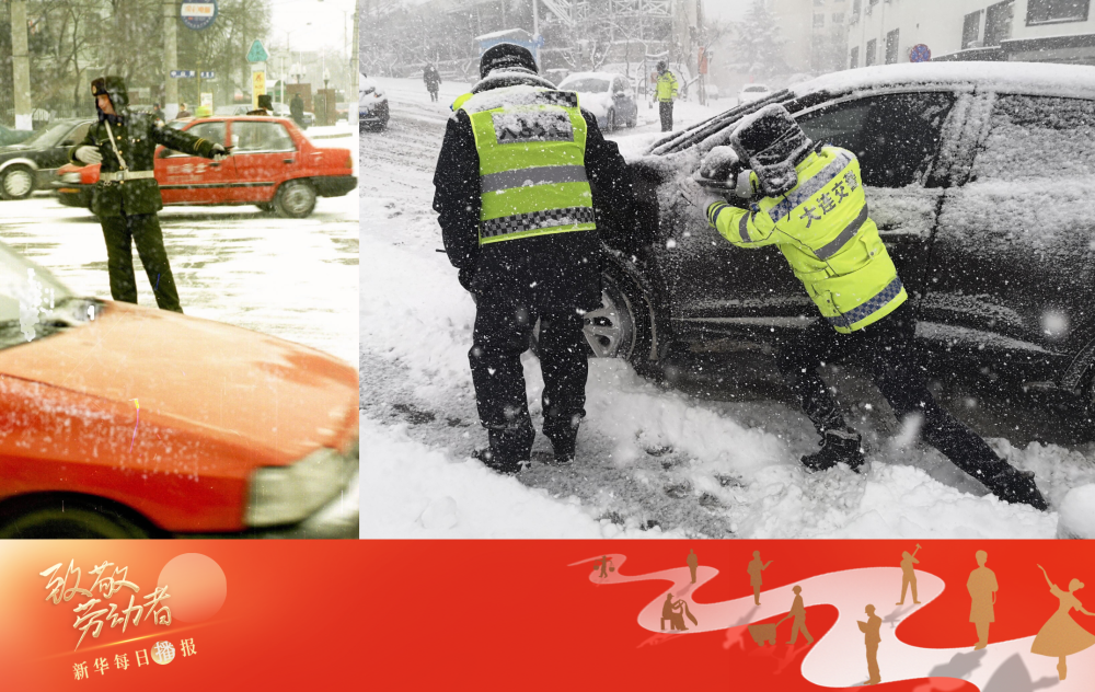 拼版照片:左图为1999年,一名交警在遭强寒流袭击的哈尔滨街头冒雪指挥(新华社记者崔峰摄);右图为2021年1月6日,大连公安交警在雪中帮群众推车(新华社发)。