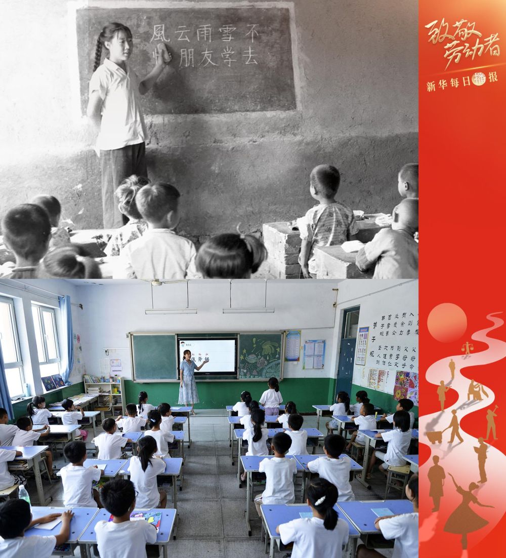 拼版照片:上图为1964年,在河北省坝县(今霸州市)的一所耕读小学,青年教师高香兰在给学生们上语文课(新华社记者梁一丁摄);下图为2019年,在河北省清河县连庄小学,老师潘海丽用电子黑板为三年级学生上语文课(新华社记者朱旭东摄)。