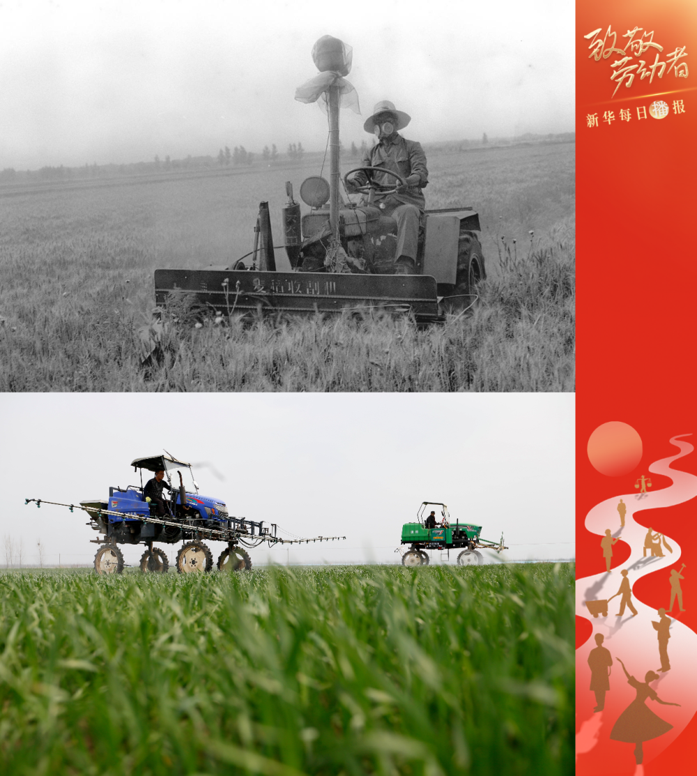 拼版照片:上图为1990年,河南省浚县白寺乡西部村农民用机械收割小麦(新华社记者王刚法摄);下图为2022年4月5日,山东省青岛市即墨区段泊岚镇刘家营里村的农民使用自走式高杆喷雾机在麦田里喷洒叶面肥(新华社发 梁孝鹏摄)。