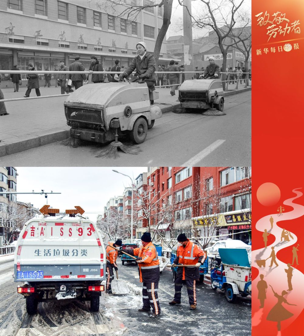 拼版照片:上图为二十世纪八十年代,北京东城区清洁一队王府井大街保洁班的清洁工在扫街(新华社记者喻惠如摄);下图为2022年3月16日,长春市朝阳区环卫工人在清运积雪(新华社记者周长庆摄)。